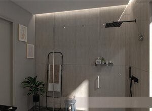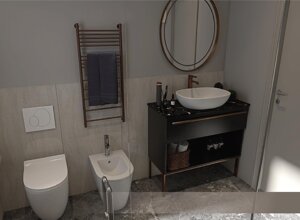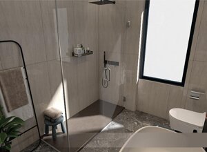 Il cliente ha richiesto il rifacimento degli impianti e la sostituzione delle finiture. Il progetto di ristrutturazione ha previsto l'uso di piastrelle in gres effetto travertino per i rivestimenti ed effetto marmo per il pavimento.